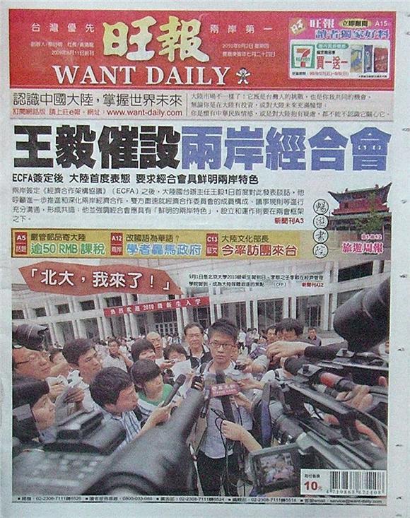 兩岸簽定《經濟合作架構協議》(ECFA)之後,大陸國台辦主任王毅1日首度對此發表談話,他呼籲進一步推進和深化兩岸經濟合作,雙方盡速就經濟合作委員會的成員構成、議事規則等進行充分溝通,形成共識;他並強調經合會應具有「鮮明的兩岸特色」,設立和運作則要在兩會框架之下。