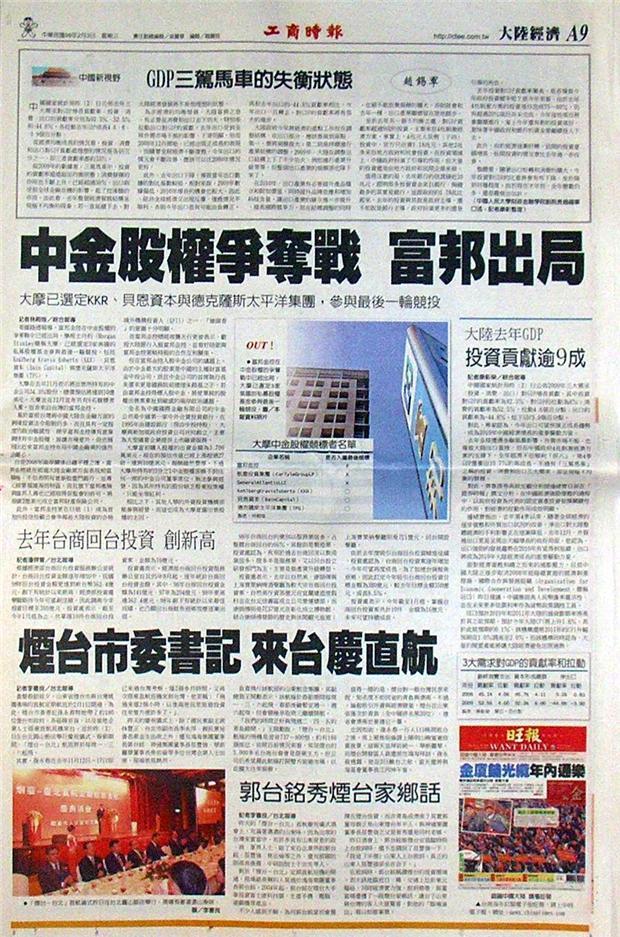 根據路透報導,富邦金控在中金股權的爭奪戰中已經出局,摩根士丹利(Morgan Stanley簡稱大摩)已經選定3家美國的私募股權基金參與最後一輪競投,包括Kohlberg Kravis Roberts(KKR)、貝恩資本(Bain Capital)與德克薩斯太平洋集團(TPG)。