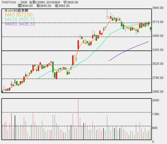 大立光4日股價收在480元,較前一日上漲8元,成交量3629張。
