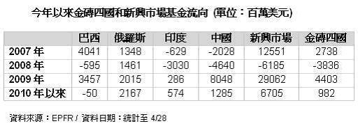 觀察每週新興市場基金流向可發現,今年以來投資人在新興國家的配置佈局偏好出現明顯變化,截至2010/5/5為止,去年火紅的拉丁美洲基金轉為淨流出7.2億美元,反倒是先前市場疑慮較大的新興歐非中東地區,持續有穩定的資金進駐,今年以來已吸金33.7億美元。