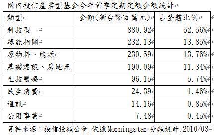 依據投信投顧公會所公佈的今年前三個月國內投信定期定額金額資料,再進一步以Morningstar的分類來分析,可以發現科技型基金仍然是投資人的最愛,但綠能相關(包含生態及替代能源股票)基金的定期定額金額緊追在後,相對於綠能基金在市場上推出僅有三年多的時間,顯示國內投資人對於相關題材的認同度相當高。