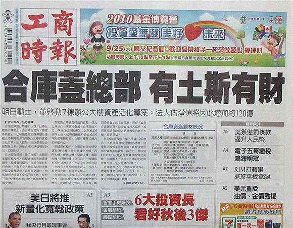 合作金庫銀行將在明(24)日舉行總部大樓動土,由合庫設置的「籌建委員會」,已研議總部大樓興建及後續北市精華地共7棟辦公大樓的資產活化方案。法人認為,合計都更及合建開發之利,將使合庫的淨值增加10%(120億元)。