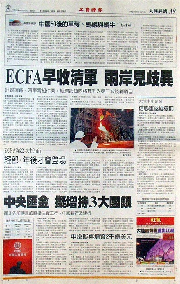 兩岸即將展開ECFA後續事務性協商,據透露,大陸同意將兩岸業者有高度共識的石化、紡織中上游、機械、汽車及自行車等項目列入ECFA早期收獲項目外,也提出將鋼鐵及汽車零組件列入早期收穫清單。但經濟部官員表示,由於國內鋼鐵及汽車零組件業未達成共識,傾向將這兩項列入第2波談判項目。