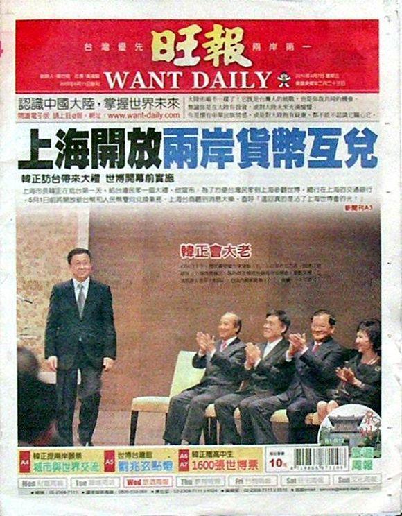 ■兩岸貨幣雙向兌換 世博先行 上海市長韓正訪台送大禮