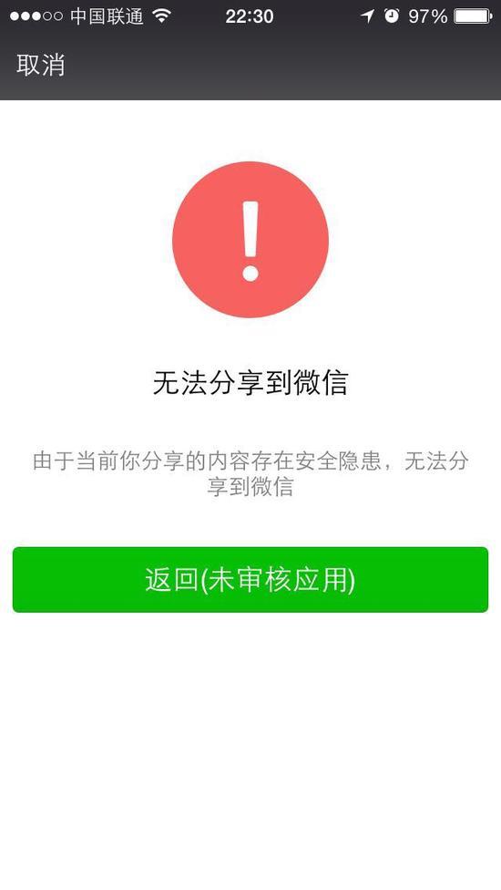 不過,微信方面或許是感受到了支付寶此舉帶來的壓力,今日晚些時候開始手應對。大約在下午2點左右,支付寶紅包出現無法分享到朋友圈的情況,但仍舊可以在微信群分享。然而到今晚21點左右,微信全面封鎖了支付寶的分享介面,導致支付寶紅包徹底無法分享到微信平台。