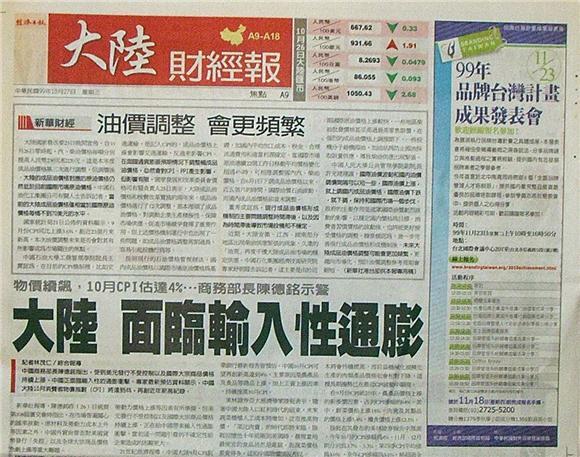 台灣主要報紙大陸版要聞標題一覽 (10月27日)
