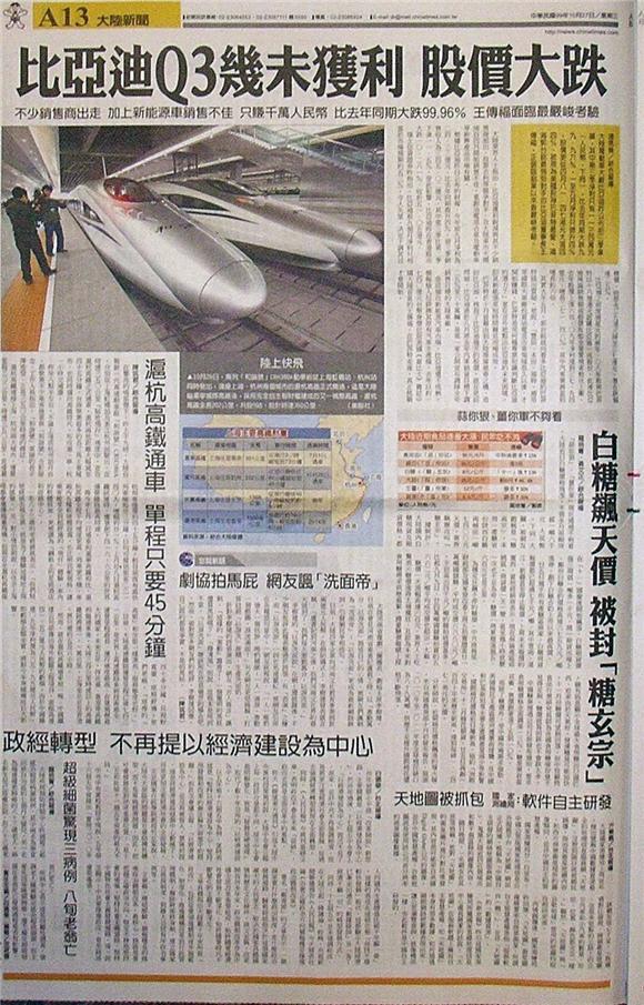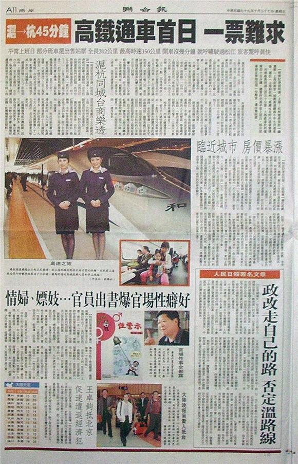 繼滬寧(上海到南京)城際高速鐵路今年七月通車後,滬杭(上海到杭州)高鐵也在昨天通車營運。列車最高時速三百五十公里,上海直達杭州僅需四十五分鐘。儘管昨天是平常上班日,部分班車卻反常地出現一位難求,還出售站票。