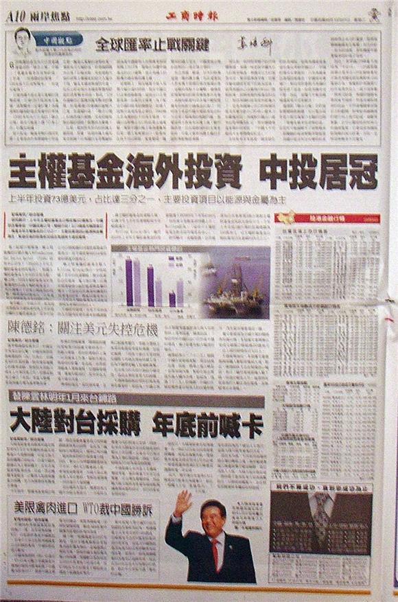 研究顯示,上半年主權財富基金公開投資222億美元,中國的主權基金─中國投資公司(簡稱中投)以73億美元穩居首位,高達全球主權基金的三分之一,主要投資項目以能源與金屬為主。緊追在後的則是新加坡淡馬錫與卡達投資局。