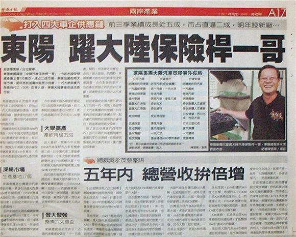 東陽集團躍居「中國汽車保險桿一哥」,今年大陸保桿總產量上看700萬支,搶占二成市場。東陽加速布局大陸市場,明年將前進廣州與長沙設廠,一汽大眾與廣汽飛雅特代工(OEM)訂單入袋,東陽大陸事業收益成長可期。