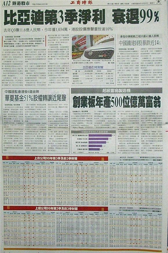 大陸電動車大廠比亞迪昨公布前三季業績,其中第三季淨利只有一一三四萬元(人民幣,下同),比去年同期大跌九九.九六%,一至九月淨利只微升四%,股價更從四月八一.四七港元大瀉四%。被視為美國股神巴菲特最愛、鴻海郭台銘最強勁對手的比亞迪董事長王傳福,正面臨創業以來最嚴峻考驗。