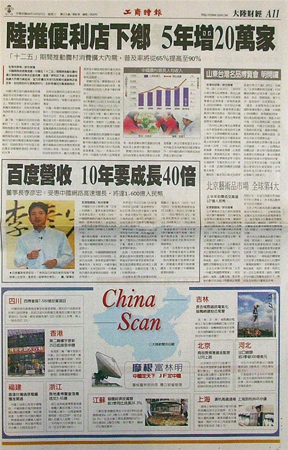 中國商務部官員透露,中國在「十二五」期間將推動在農村建立連鎖商店政策來拉動消費,這個「便利店下鄉」政策被視為擴大內需方案延伸,官方計畫在未來5年將鄉村連鎖商店普及率,從目前的65%提高到90%,估計將增加20萬連鎖商店。