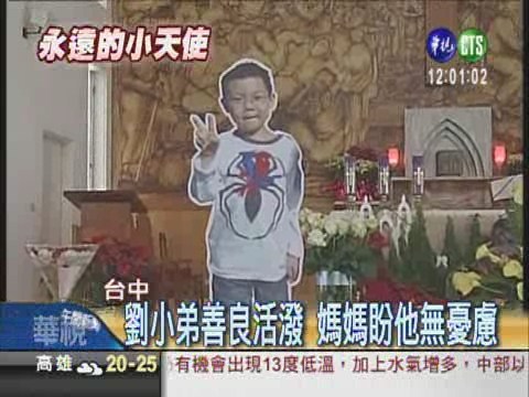 台中七歲劉小弟,疑似打新流感疫苗死亡,儘管再捨不得,爸媽還是忍著悲傷,下午要幫劉小弟舉辦告別式,早上劉媽媽親自佈置告別式會場,擺了很多小天使,因為她說兒子善良天真,希望他成為一個快樂的小天使。 一身黑衣、黑褲,憔悴的雙眼掩不住劉媽媽內心的哀傷,但她還是強打起精神,帶著兒子的人型立牌到會場,照片中他比出勝利手勢,笑容燦爛,劉媽媽說,兒子善良活潑,討人喜歡,希望他能像小天使一樣,永遠無憂無慮,告別會場上,劉媽媽希望不要有悲傷的情緒,所以特地佈置很多小天使和絨毛小熊,可愛溫馨,不像是告別式,反而像是耶誕派對。 劉媽媽親手為兒子製作短片,裡頭紀錄從他剛出生,過生日,帶著卡通面具變裝,幼稚園畢業戴方帽,在美術教室畫畫,全家到國外去旅行,照片中的一家人是那麼幸福,但卻因為打了一劑新流感疫苗,全變了樣,下午家人和學校老師要為劉小弟舉辦告別式,而他天真燦爛的笑容,永遠留在愛他的人心中。