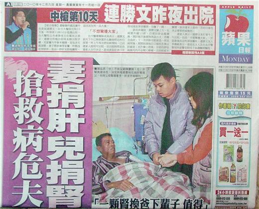 ◆蘋果日報:搶救病危夫 妻捐肝 兒捐腎 「一顆腎換爸下輩子 值得」