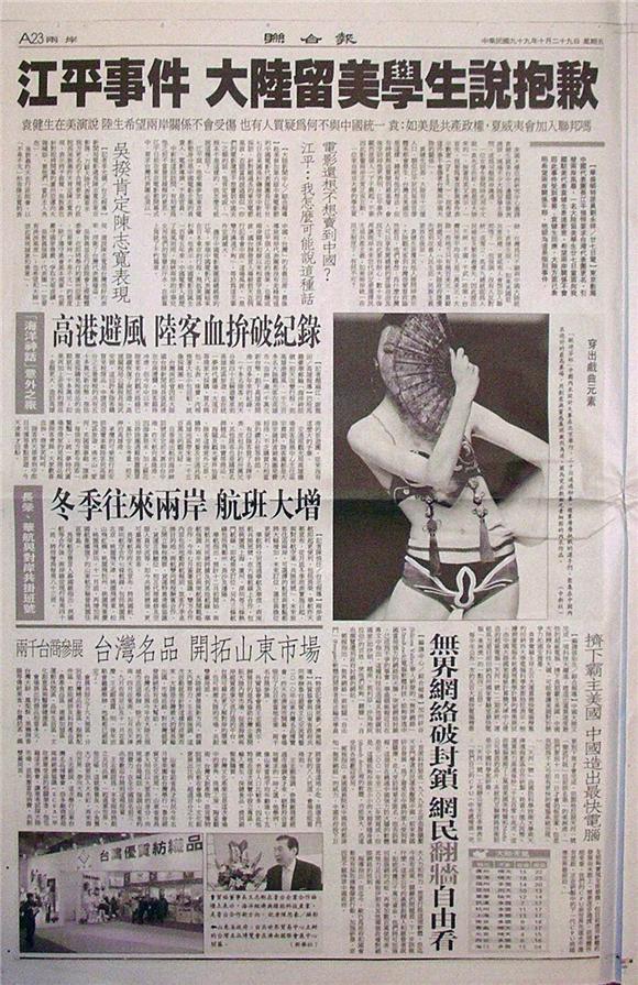台灣主要報紙大陸版要聞標題一覽 (10月29日)