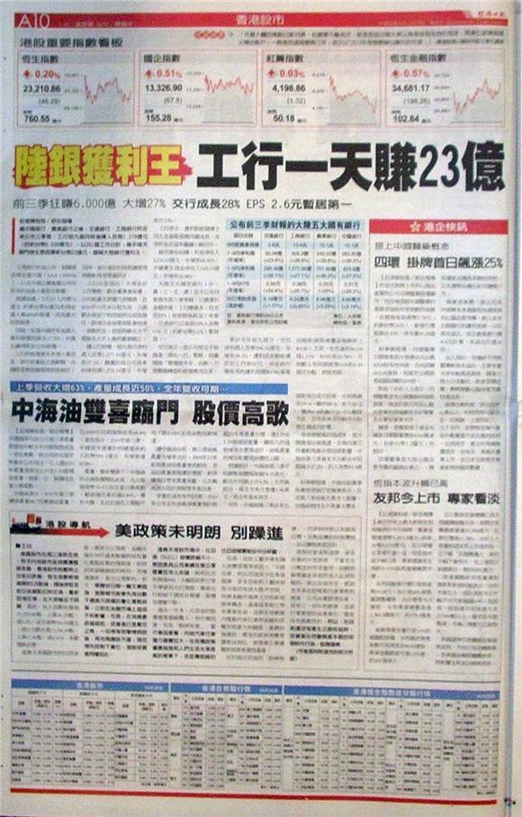 繼中國銀行、農業銀行之後,交通銀行、工商銀行昨在港公布三季報;工行前九個月稅後賺人民幣1,278億元(約新台幣6,006億元),以261個工作日計,幾乎每天開門做生意就賺新台幣23億元,堪稱大陸銀行獲利王。