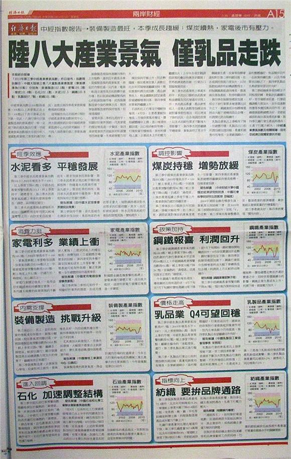「2010年第三季中經產業景氣指數」昨日發布,指數報告顯示,中國大陸第三季八大重點產業景氣度(景氣標準為100點)分別為:裝備製造102.0點、家電100.3點、煤炭101.8點、石化102.1點、水泥102.3、鋼鐵100.8點、乳製品97.7點、紡織101.0點。