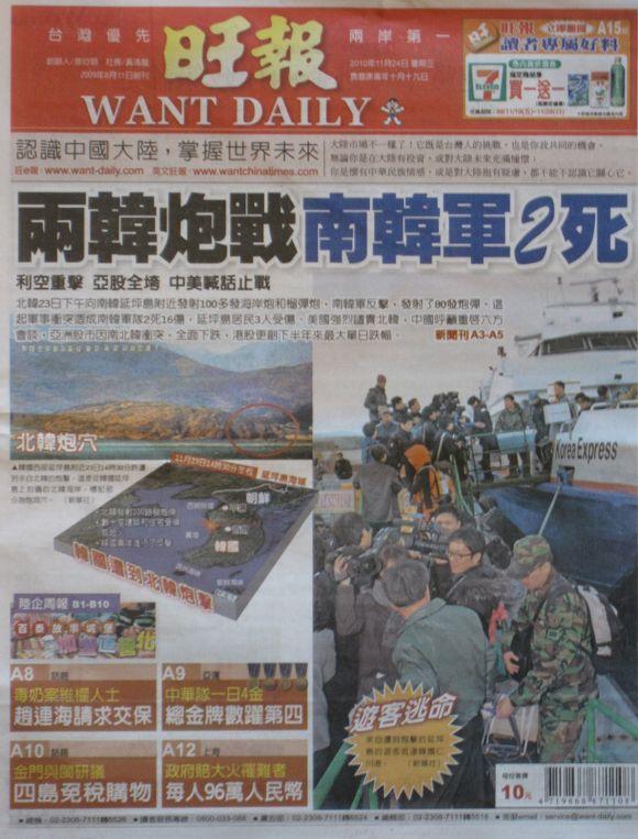 北韓23日下午向南韓延坪島附近發射100多發海岸炮和榴彈炮,南韓軍反擊,發射了80發炮彈。這起軍事衝突造成南韓軍隊2死16傷,延坪島居民3人受傷。美國強烈譴責北韓,中國呼籲重啟六方會談,亞洲股市因南北韓衝突,全面下跌,港股更創下半年來最大單日跌幅。