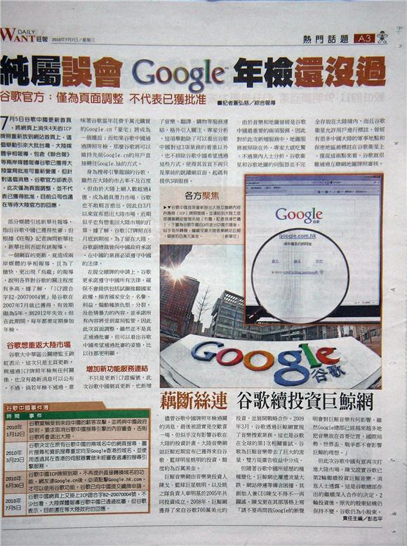 月5日谷歌中國更新首頁,將網頁上消失4天的ICP牌照重新放到網站首頁上,這個舉動引來大批台灣、大陸媒體爭相報導,包含《聯合報》等兩岸媒體報導谷歌已獲得大陸當局批准可重新營運。但針對這個消息,谷歌官方卻表示,此次僅為頁面調整,並不代表已獲得批准,目前公司也還在等待大陸官方的回應。