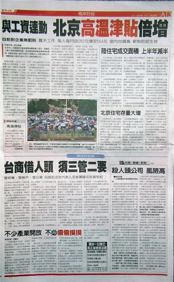 剛進入7月,中國大陸許多地方的溫度就天天飆高,北京南郊氣象台這一兩天的溫度已經高達攝氏40.6℃,打破1951年來的最高溫度,北京市政府決定要調高「最低高溫津貼」1倍,提高到每月不得低於120元人民幣(下同)。中國各地政府現在也積極提醒企業要記得發放高溫津貼,但許多勞工還是抱怨沒有領到,甚至希望不要給高溫津貼,放高溫假比較實在。