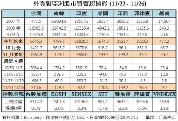 今年來上漲動能最強的新興亞洲市場,近期在中國可能升息、歐洲債信危機,及兩韓軍事衝突等利空消息衝擊下,使得外資對亞股態度偏保守操作。整體新興亞股上週遭外資賣超1.14億美元,不過台灣、印度和越南則是呈現買超情況,其中外資買超台股金額最大,達3.16億美元。今年來漲勢凌厲的東南亞股市,儼然成外資提款機,泰國、菲律賓均已經是連續第3周遭到賣超調節。