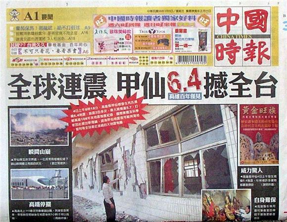 ◆中國時報:全球連震 甲仙6.4撼全台 高雄百年僅見