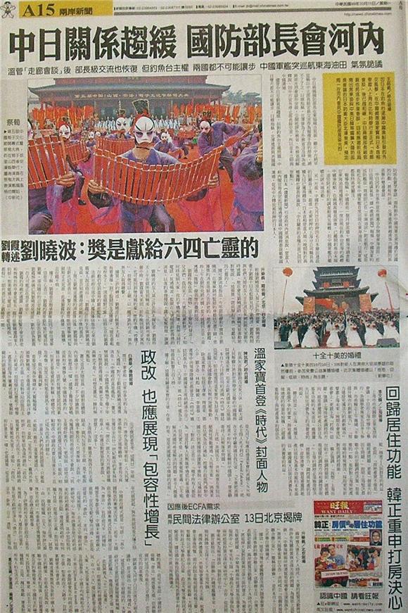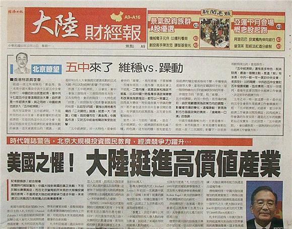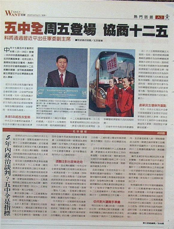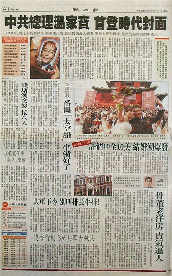 台灣主要報紙大陸版要聞標題一覽 (10月11日)