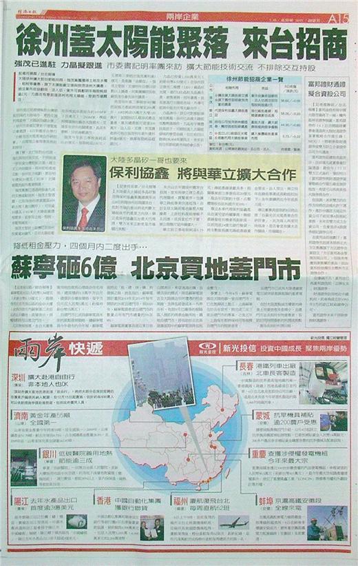 大陸徐州擴大對台節能招商,強茂集團獲得土地及水電、租稅等優惠,旗下太陽能廠艾德與熒茂徐州大擴產,挹注業外收益翻倍、法人估,業外可貢獻明年每股純益逾2元;力晶也有意前進徐州布局太陽能,受到市場關注。