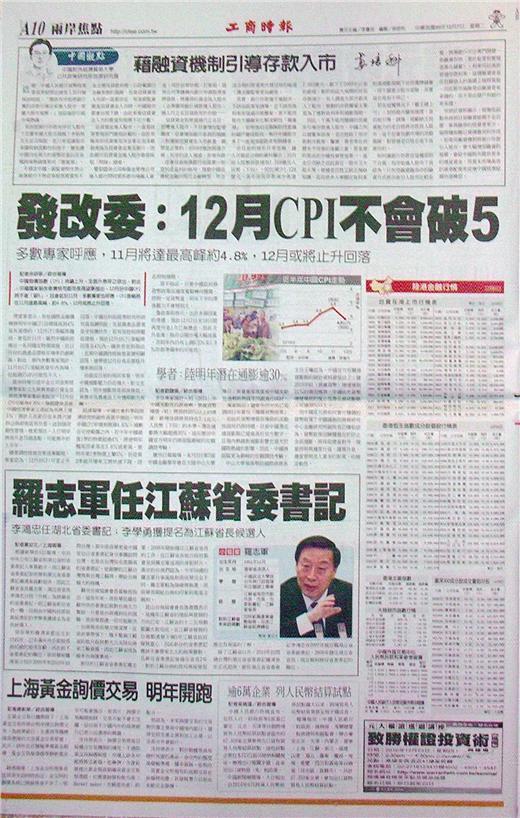 中國物價指數(CPI)持續上升,全面升息呼之欲出。對此,中國國家發改委價格司副司長周望軍指出,12月份中國CPI將不會「破5」,且會低於11月。多數專家也呼應,CPI漲幅將在11月達最高峰,約4.8%,12月或將止升回落。