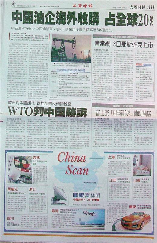 中國企業「走出去」戰略大有進展!研究報告指出,今年1~10月,中國企業在海外收購石油與天然氣資源的投資達246億美元,占全球此類交易的20%,比兩年前激增4倍多。