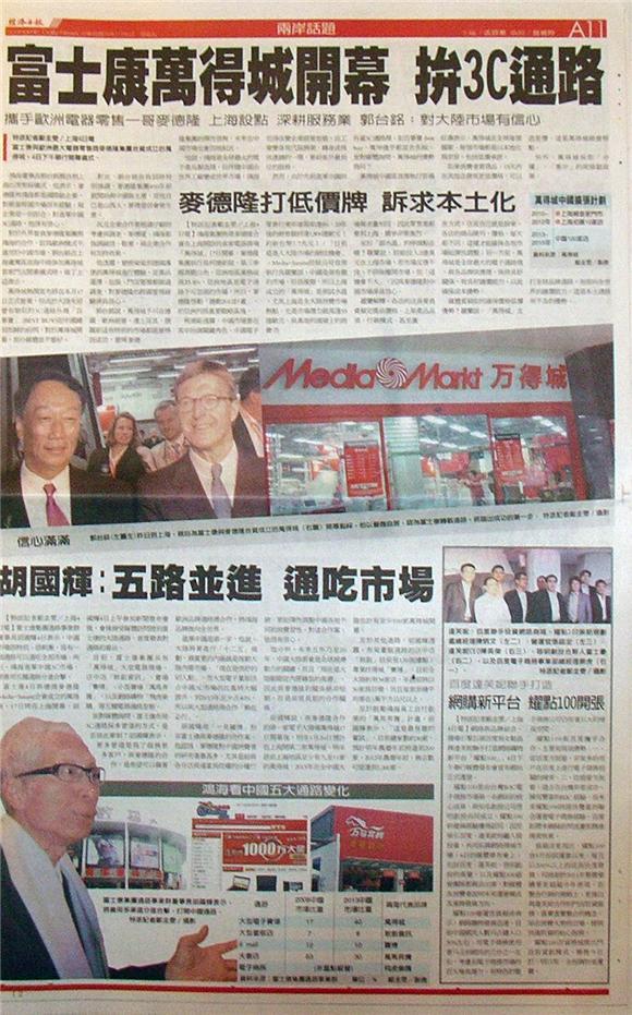 富士康與歐洲最大電器零售商麥德隆集團合資成立的萬得城,4日下午舉行開幕儀式。