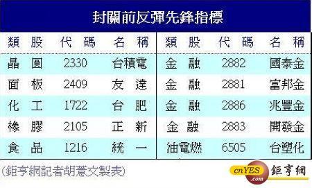 大慶證券研究部挑選出的10檔反彈先鋒權值股分別為電子權值股台積電(2330-TW)、友達(2409-TW),食品股統一(1216-TW)、化工與資產股台肥(1722-TW)、橡膠股正新 (2105-TW)、油電燃氣股台塑化(6505-TW),以及金融股國泰金(2882-TW)、富邦金(2881-TW)、兆豐金(2886-TW)、開發金(2883-TW)。其中又以周六收盤時翻紅的台積電、友達、台塑化、開發金與兆豐金,「表態」意味更加明顯。