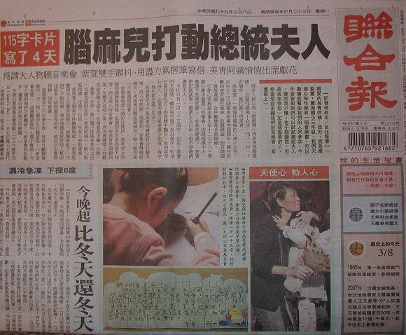 ◆聯合報:115字卡片寫了4天 腦麻兒打動總統夫人