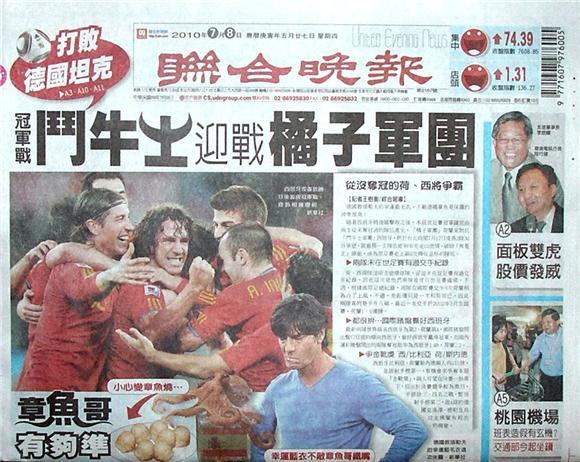 隨著西班牙將德國擊敗之後,本屆世足賽冠軍確定由兩支從未奪冠過的隊伍產生,「橘子軍團」荷蘭來對抗「鬥牛士軍團」西班牙,於台北時間7月12日凌晨2時30分爭冠,就看那一支隊伍能夠率先走出悲情,破除「無冕王」頭銜,成為世足賽史上第8支捧住金杯的隊伍。