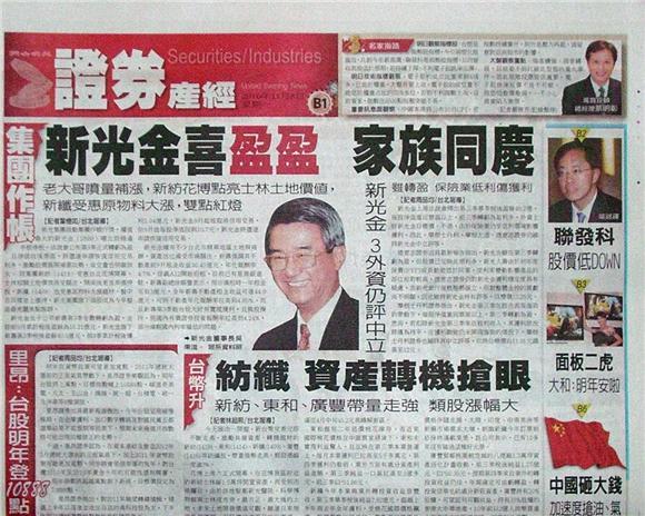 新光集團啟動集團作帳行情,權值最大的新光金(2888)噴出勁揚逾半根停板,法說會公布第3季正式轉虧為盈且淨值收復票面,將儘速申請恢復信用交易利多,激勵股價展開補漲攻勢,成交量也明顯放大; 同集團新紡(1419)受惠台北花博開幕,士林相關土地價值再受關注,開高後更直奔漲停板,新纖(1409)也受惠原物料大漲題材,盤中亦同樣登上漲停,新光集團旗下個股成為今早盤面最亮麗焦點族群。