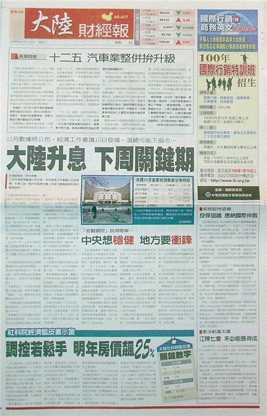 中國社會科學院昨(7)日發布 2011年「經濟藍皮書」指出,中國大陸2010年GDP成長率將達到9.9%,明年可望挑戰10%,對民眾關心的房價問題,社科院預估,今年房價上漲15%,明年若房市調控政策放鬆,房價可能出現強勁反彈,上漲幅度可能達20%至25%。