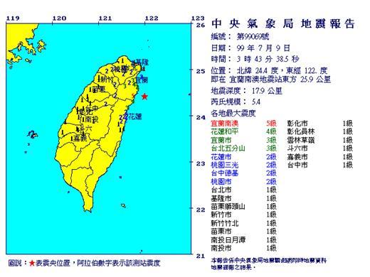 各地震度情形為:宜蘭南澳 5 級,花蓮和平 4 級,宜蘭市與台北五分山 3 級,花蓮市、桃園三光、台中德基與桃園市 2 級,台北市、基隆市、新竹市、南投市、苗栗市、彰化市、嘉義市與台中市 1 級。
