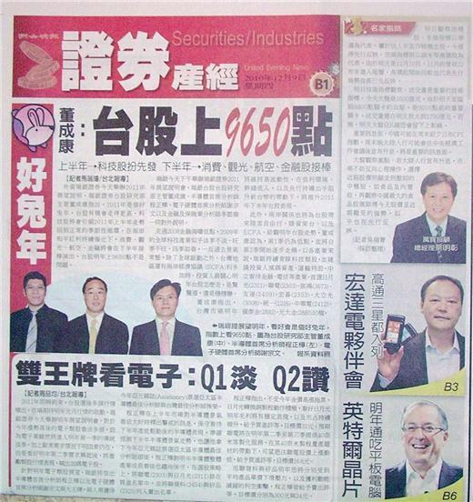 外資瑞銀證券今天舉辦2011年展望說明,瑞銀證券台股研究部主管董成康指出,2011年是個好兔年,台股有機會走得更高,科技股將會引領2011年上半年走勢回到正常的季節性循環,在兩岸和平紅利持續催化下,消費、觀光、航空、金融將會在下半年接棒演出,台股明年上9650點不是問題。