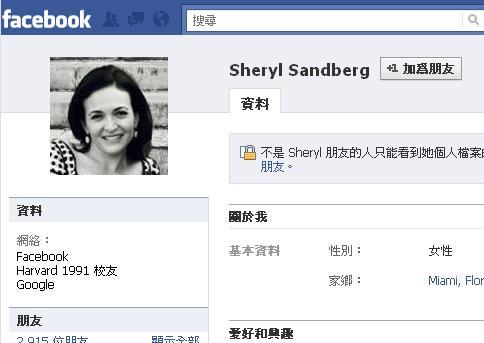 Sheryl Sandberg擔任Facebook營運長,也是網站2年多來大紅大紫的重要功臣。(圖為她個人的Facebook頁面)