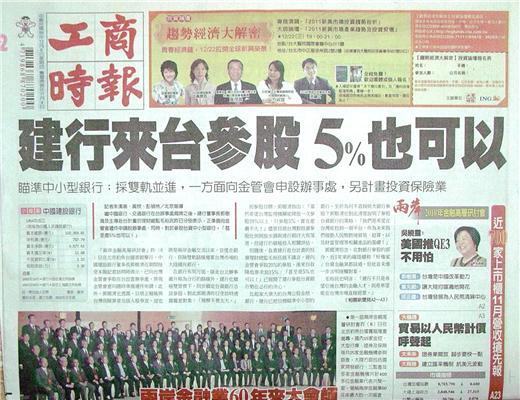 ◆工商時報:建行來台參股5%也可以