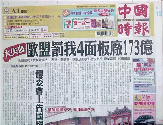 ◆中國時報:大失血 歐盟罰我4面板廠173億