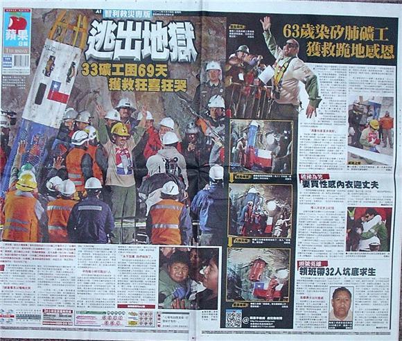◆蘋果日報:逃出地獄 33礦工困69天 獲救狂喜狂哭
