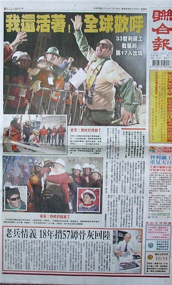 智利受困地底69天的礦工昨重見天日!台灣時間昨天上午11時12分(智利時間13日凌晨零時12分),31歲礦工阿瓦洛斯最先被「鳳凰號」救生艙拉上地面,現場歡聲雷動,至今凌晨一時已有17名礦工獲救,救援行動預計今天結束,33名礦工將被全數帶回地面。這是歷來被困地底存活時間最長的紀錄,40歲礦工塞浦維達脫困後說,地底生活「與主同在,也與魔鬼同在,但主拉住了我!」