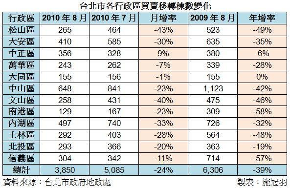 台北市地政處今(13)日公佈8月份建物買賣移轉棟數,較7月明顯下滑24%,已連續3個月衰退,較去年同期減少38.95%,更創下近18個月以來的新低紀錄,也幾乎是金融海嘯初期的交易水準,政策影響十分顯著。就各區域分析,以松山區衰退42.89%,文山區減少40.14%,表現最差;而中正區則逆勢成長8.54%,表現最佳。