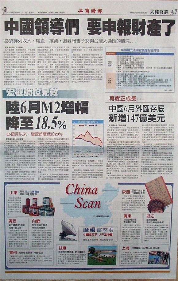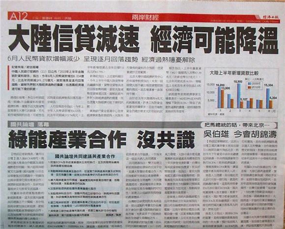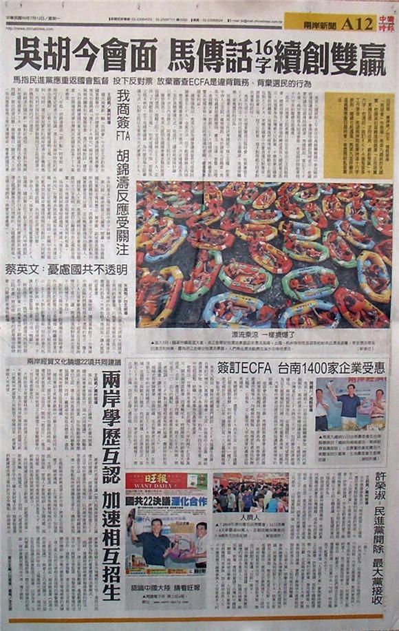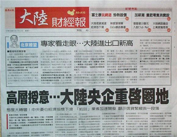 台灣主要報紙大陸版要聞標題一覽 (7月12日)