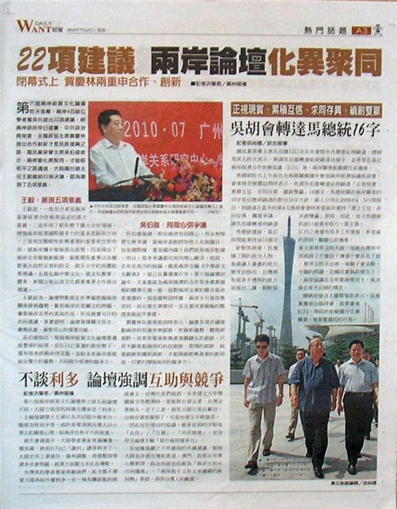 第六屆兩岸經貿文化論壇昨天落幕,兩岸4百餘位學者菁英共提出22項建議,盼兩岸政府早日落實。中共政治局常委、全國政協主席賈慶林提出合作創新才是民族復興之路;國民黨榮譽主席吳伯雄表示,兩岸要化異聚同,才能朝和平之路邁進。大陸國台辦主任王毅總結22條決議,認為展現了五項意義。