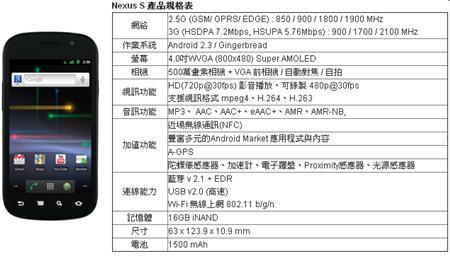 Nexus S與其規格 (圖片來源:三星手機官網)
