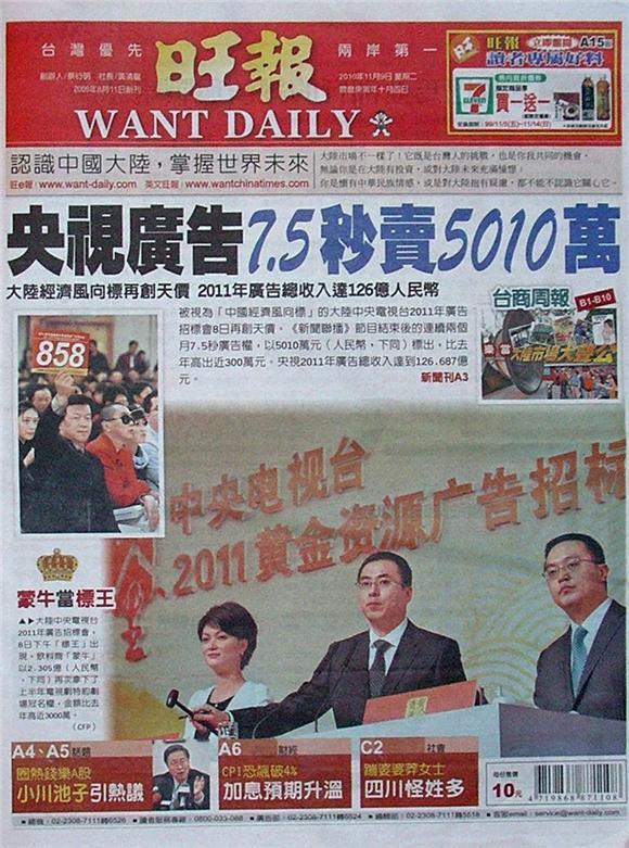 被視為「中國經濟風向標」的大陸中央電視台2011年廣告招標會8日再創天價。《新聞聯播》節目結束後的連續兩個月7.5秒廣告權,以5010萬元(人民幣,下同)標出,比去年高出近300萬元。央視2011年廣告總收入達到126.687億元。