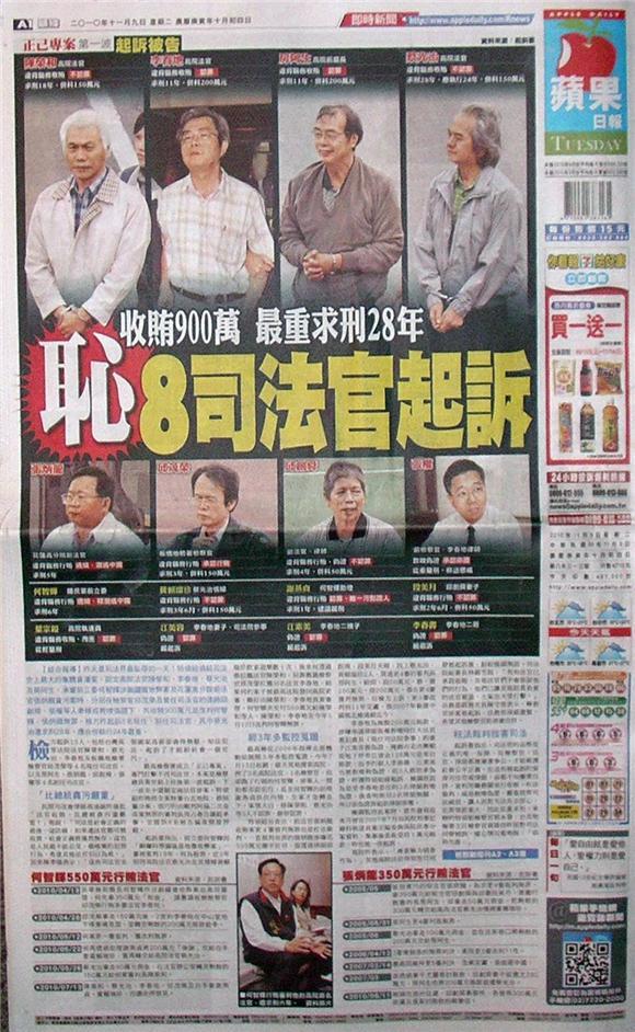 ◆蘋果日報:恥 8司法官起訴 收賄900萬 最重求刑28年
