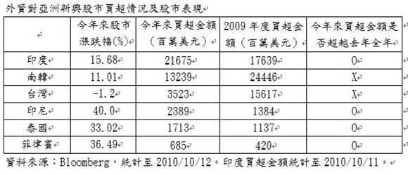 全球熱錢持續湧進亞洲新興股市,根據Bloomberg資料統計,今年來外資買超印度、印尼、泰國、菲律賓股市的金額已經超越去年全年,推動股匯市大漲,即使各國央行出面捍衛,10月以來外資依然買超不斷。