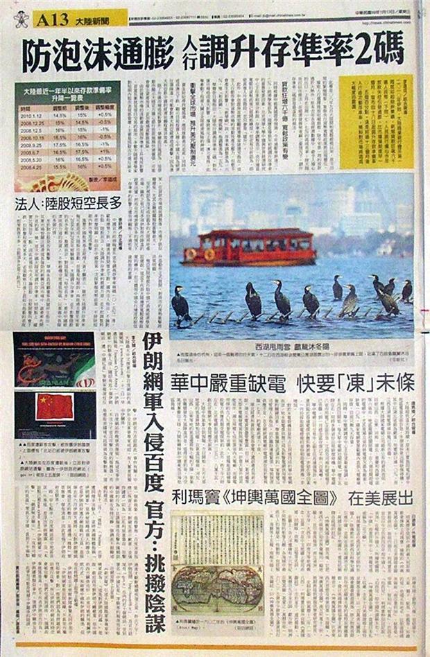 台灣主要報紙大陸版要聞標題一覽 (1月13日)